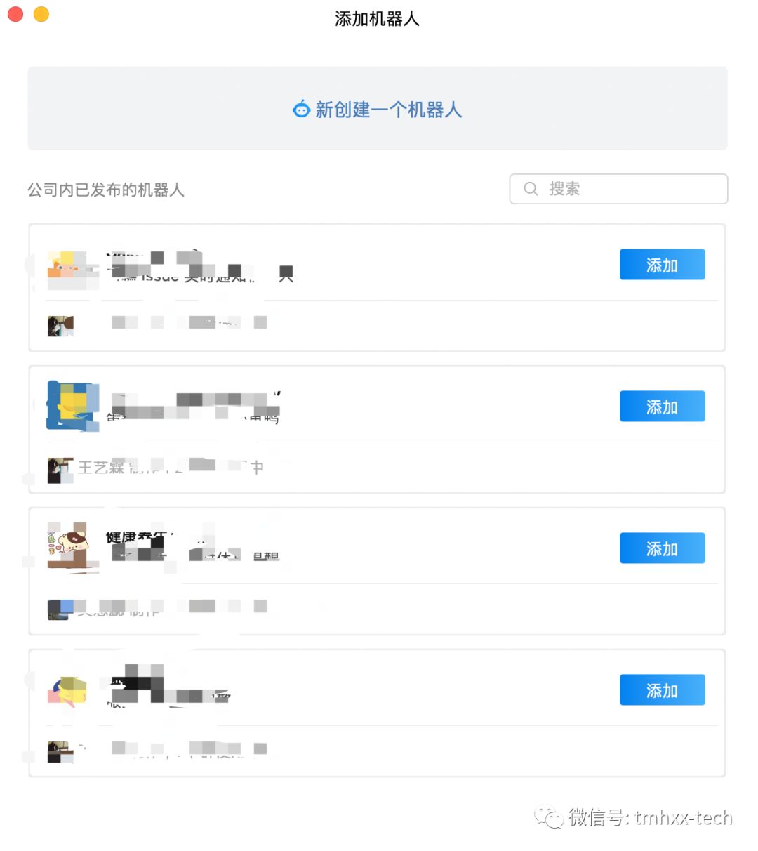 点击添加机器人之后,会出现当前公司已经在使用的群机器人,可以直接添加已存在的机器人,或者新创建一个机器人。