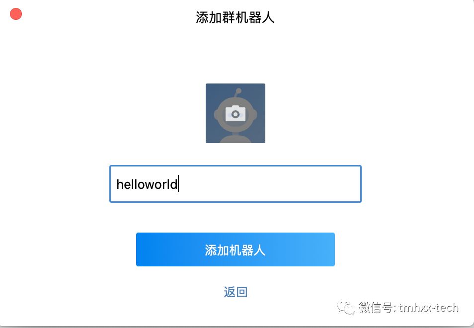 点击新创建一个机器人之后,会要求设置机器人的名称(必选)以及机器人的头像(非必选)。