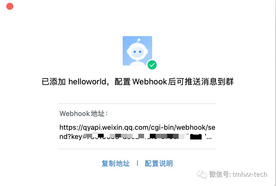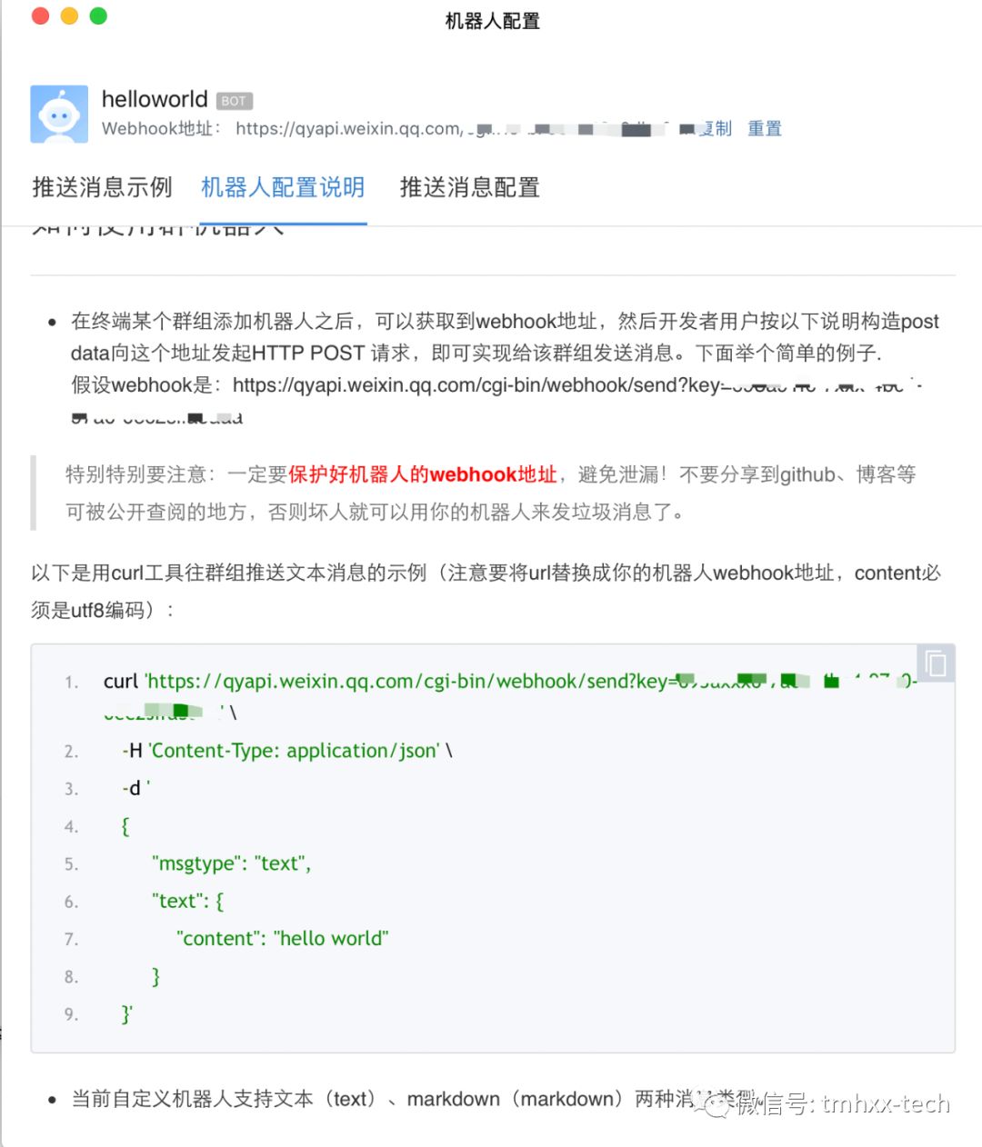 设置好之后就会出现机器人的webhook地址,同时也会有使用说明