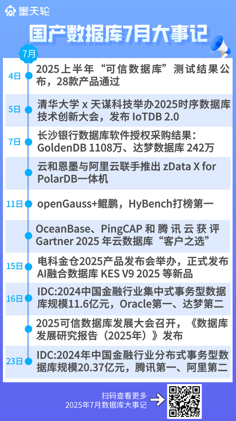长沙银行千万级大单采购GoldenDB和达梦数据库;秦皇岛银行近七百万TDSQL扩容采购项目落地。2025可信数据库发展大会召开,28款产品通过中国信通院2025上半年“可信数据库”评测。OceanBase、PingCAP、腾讯云获评Gartner 2025云数据库“客户之选”;openGauss +鲲鹏在HyBench打榜第一;Zilliz Cloud在Azure印度区正式开服;电科金仓2025产品发布会成功举办,发布AI时代融合数据库KES V9 2025、数据库一体机(云数据库AI版)等多款新品;天谋科技2025时序数据库技术创新大会发布IoTDB 2.0版本;云和恩墨与阿里云联手推出 zData X for PolarDB一体机;此外,开放原子KWDB核心贡献挑战赛启动;TiDB集群运维管控平台TEM on Cloud限时免费试用活动开展。