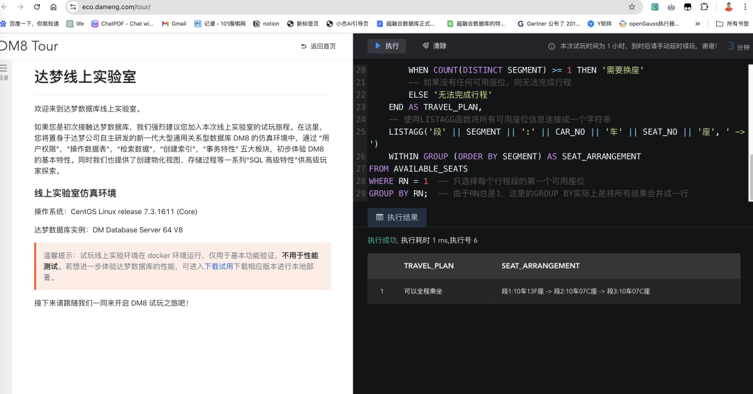 如果有人嫌这种方式麻烦,其实铁路部门还是可以考虑对分段乘坐做一个折扣优惠。这样看在钱的份上,大家也不会嫌弃中途换座位的麻烦。当然了,在春运这种一票难求的时候,就不用考虑折扣了,能多送一个乘客回家团圆,那可是功德无量的事。今天在动车上做试验,写的SQL脚本是Oracle语法,结果写完脚本后发现自己的Oracle测试环境连不上,咋办,不验证一下脚本正确与否心里不踏实啊。忽然想起了达梦数据库和Oracle兼容性很高,于是给达梦的老朋友黄海明老师打了个电话求救,结果他给了一个免费的在线达梦环境,于是我测试了一下,哇,一次性输出正确的我要的结果,看来达梦数据库对Oracle的兼容性名不虚传啊。
