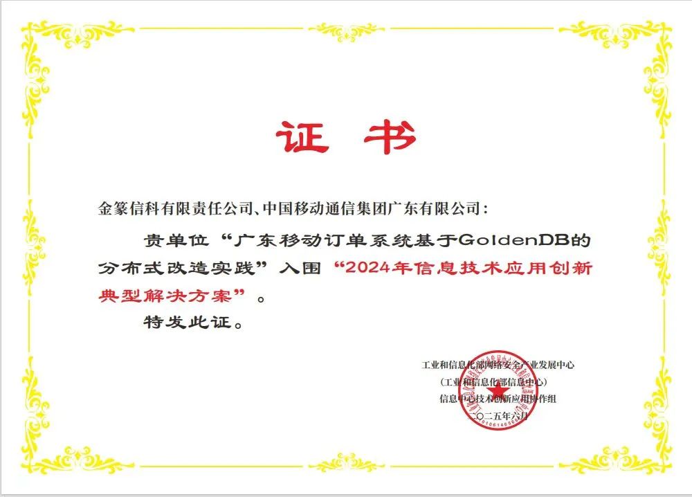 值得一提的是,这是金篆数据库GoldenDB连续第5年入围工信部信息技术应用创新典型解决方案。过去4年,金篆数据库GoldenDB申报的“银行核心系统分布式数据库解决方案”、联合中移动信息技术有限公司申报的“中国移动全网客户中心数据库自主创新实践”、申报的“面向关键行业重点应用的国产信创分布式数据库解决方案”、联合浙江移动申报的“浙江移动核心账务系统基于GoldenDB的分布式改造实践”先后入选。