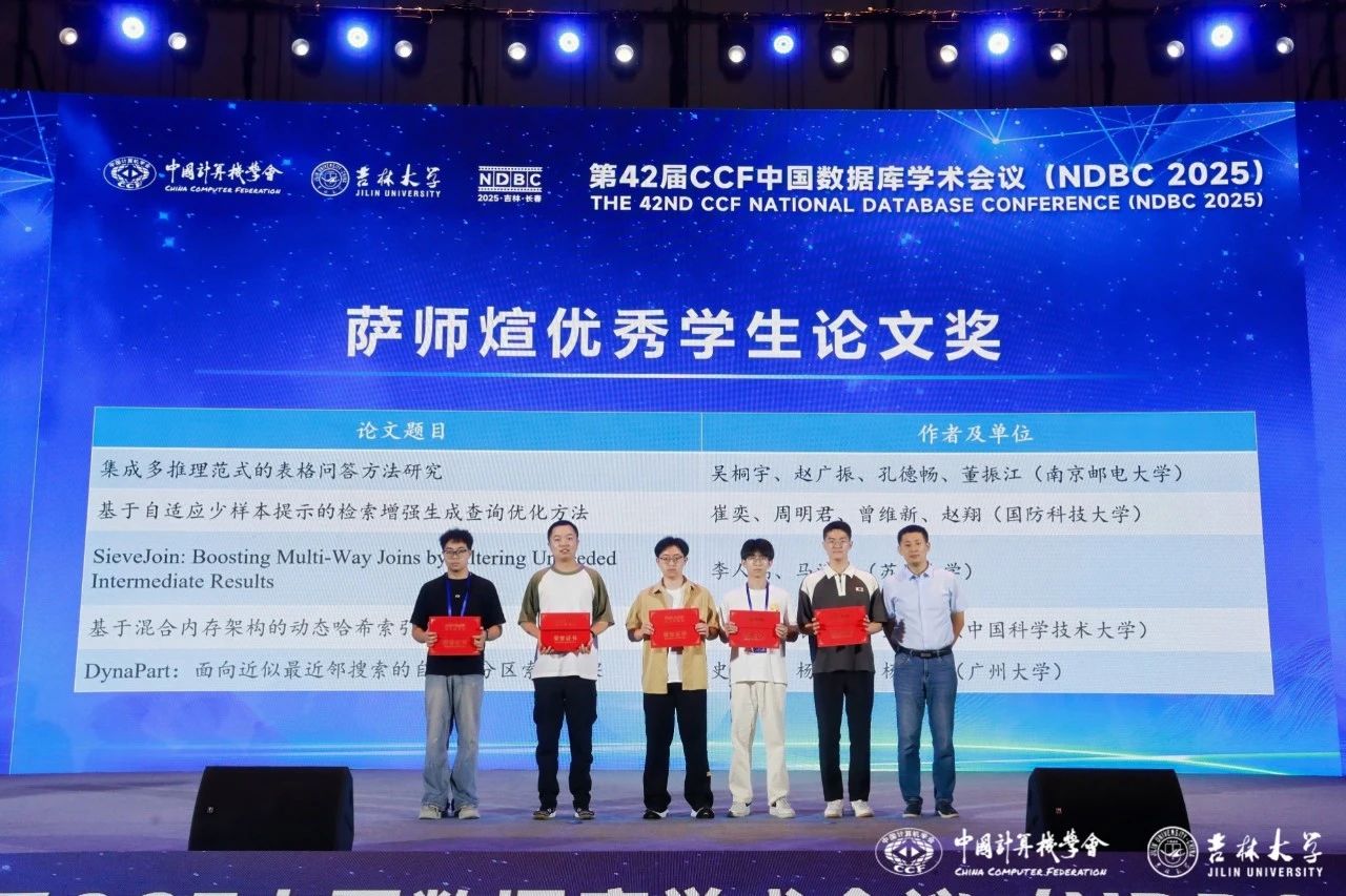 2025年8月1日至3日,由中国计算机学会(CCF)主办、中国计算机学会数据库专业委员会承办的第42届中国数据库学术会议(NDBC 2025)在长春举行。作为数据库专委会的长期铂金合作单位及国产数据库的先行者,电科金仓再次受邀参加本届会议,并为数据库领域杰出人才颁发了萨师煊优秀学生论文奖,以实际行动传承萨师煊精神,共绘中国数据库发展新蓝图。