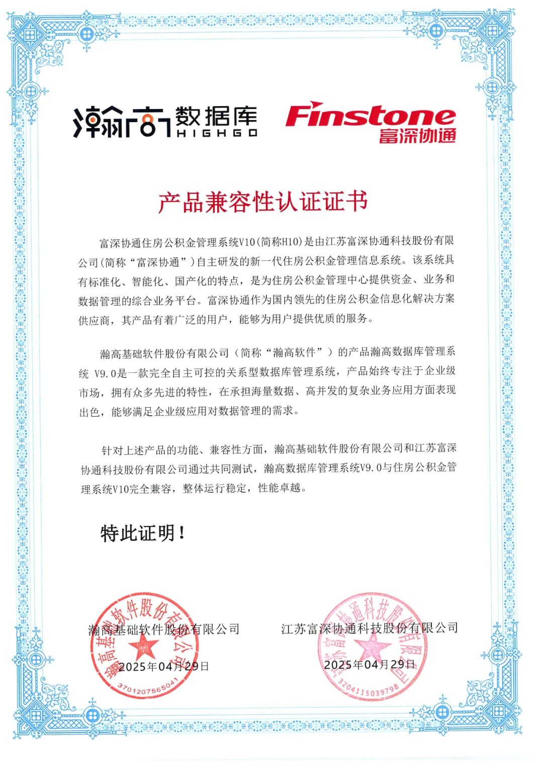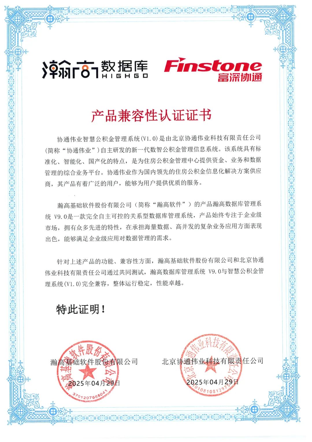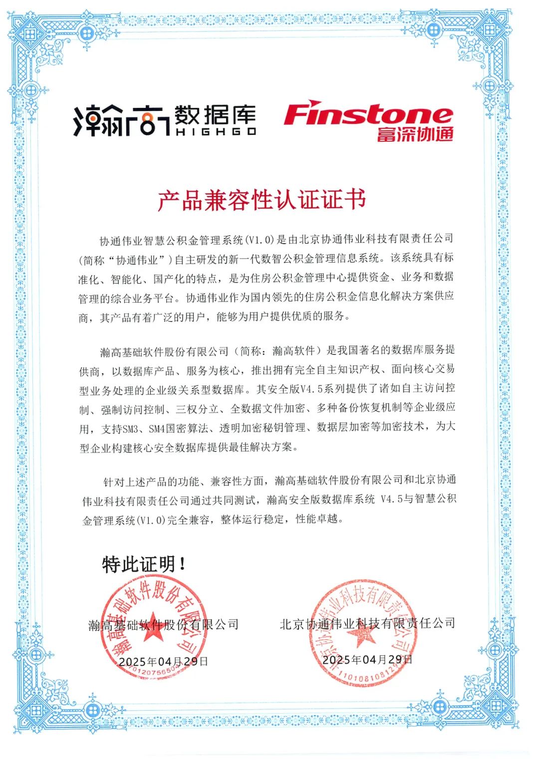 「协通伟业」作为行业数字化转型的先行者,依托江苏富深协通科技股份有限公司三十余年在财政金融、数据治理等领域的深厚积淀,已构建覆盖全国的服务网络。公司创新成果显著,首创“业务系统+数据平台”双轮驱动模式,建立房产楼盘画像系统实现风控精细化管理;打造全流程智能风控体系,实现业务监管闭环运行;率先部署基于DeepSeek的智能客服系统,开创AI技术在公积金领域应用先河......「瀚高股份」作为国内数据库领军企业,始终致力于深耕住房金融领域,以技术创新驱动行业发展。瀚高数据库技术实力在某省会城市新一代智慧公积金系统中也得到充分验证,是全国首个支撑千万级人口城市公积金业务的全栈本土化系统,其稳定运行充分证明了瀚高数据库在高并发、大数据量场景下的卓越性能。目前,经严格测试验证,瀚高股份核心产品——瀚高安全版数据库系统V4.5与瀚高数据库管理系统V9.0,与协通伟业智慧公积金管理系统(V1.0)、富深协通住房公积金管理系统V10完全兼容,整体运行稳定且性能卓越。此举标志着双方技术体系已达成深度融合,为后续合作筑牢了坚实基础。下一步,双方将秉持“优势互补、互利共赢”原则,以新一代信息技术赋能公积金服务提质增效,共同打造数字政务建设标杆,为服务民生保障、促进经济社会高质量发展作出更大贡献。