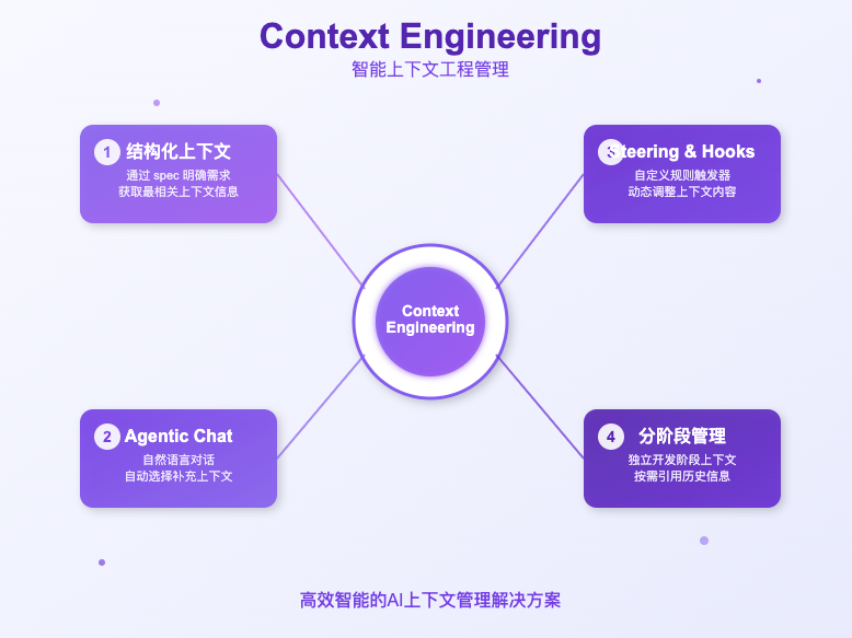无论是 TRAE 的 SOLO 还是 Kiro 的 spec 专家模式,本质上都在通过工程化手段管理 AI/Agent 的上下文,以提升智能体的任务完成能力和效率。这正是 context engineering 的核心思想。