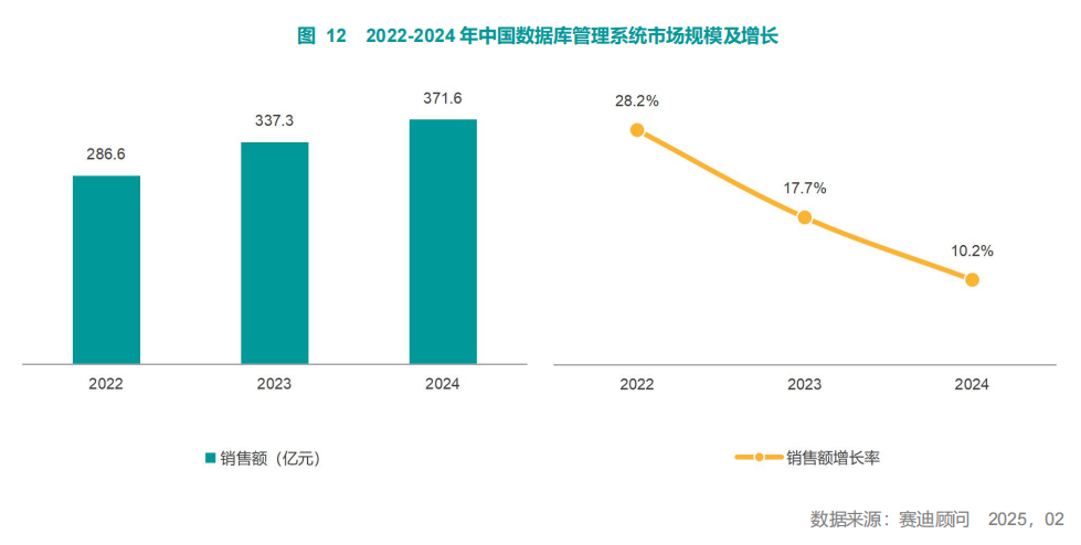 报告指出,2024年中国数据库市场规模达371.6 亿元,占比为42.1%,市场增长较快。中国厂商的影响力正逐步提升,在众多细分行业取得了大量的市场。