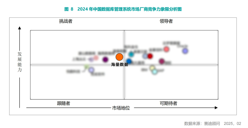报告根据发展能力和市场地位,将数据库厂商分为领导者、挑战者、可期待者和跟随者四个象限。海量数据位居“挑战者”象限,并被评为发展能力最强的数据库厂商。