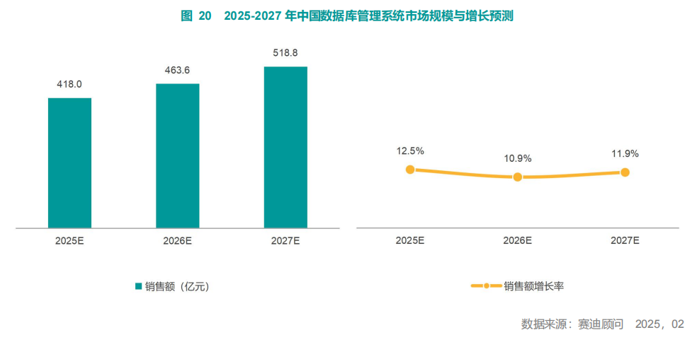 报告显示,未来三年,中国数据库市场仍将保持快速增长。预计到 2027年,市场规模将达到518.8亿元。数据量剧增带来的市场需求增加仍将持续,金融、电信、医疗等行业的核心业务系统,将加速升级。
