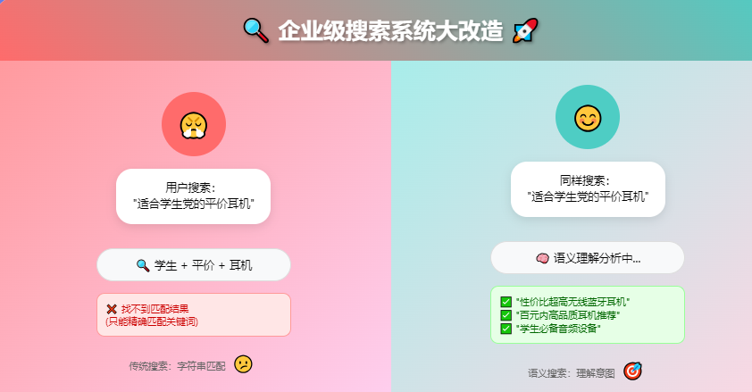 做企业级搜索系统改造时遇到了一个老生常谈但又必须解决的问题:传统关键词搜索的语义理解能力实在太弱了。用户搜索"适合学生党的平价耳机",系统只能匹配到标题中包含"学生"、"平价"、"耳机"这些关键词的商品,而那些真正物美价廉但描述为"性价比超高无线蓝牙耳机"的产品却检索不到。