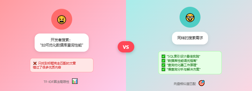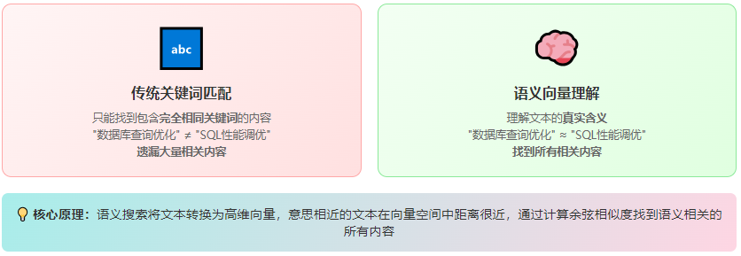 更典型的场景是技术文档搜索。开发同学搜索"如何优化数据库查询性能",传统搜索只能找到标题完全匹配的文章,而那些内容中深入讲解 SQL 优化、索引设计的优质文档因为标题措辞不同就被埋没了。这种语义鸿沟让搜索体验大打折扣,用户经常需要尝试多种关键词组合才能找到想要的信息。