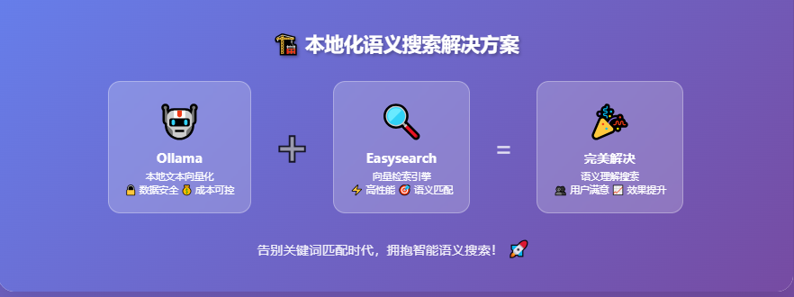 经过技术选型,最终选择了 Ollama + Easysearch 的组合:Ollama 负责本地化的文本向量化,Easysearch 作为搜索引擎提供向量检索能力。