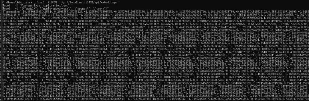 nomic-embed-text是一个轻量级但效果不错的文本向量化模型,768 维输出,对中英文都有不错的支持。启动后可以通过简单的 HTTP 请求测试: