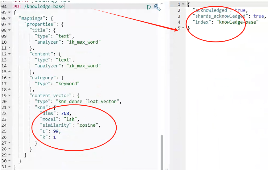 type 设置为 knn_dense_float_vector 表示这是向量检索字段; dims 必须与 embedding 模型输出维度保持一致,nomic-embed-text是768维; model 选择 lsh 算法,在检索精度和性能之间取得很好的平衡; similarity 选择 cosine 余弦相似度,更适合文本语义比较。