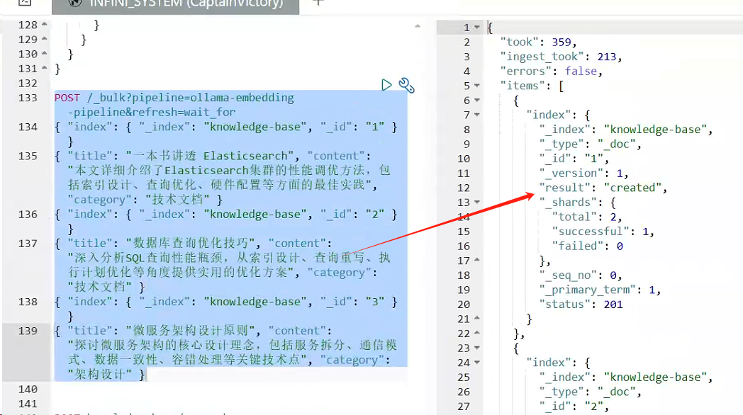 使用配置好的 Pipeline 批量导入文档,系统会自动为每个文档生成向量: