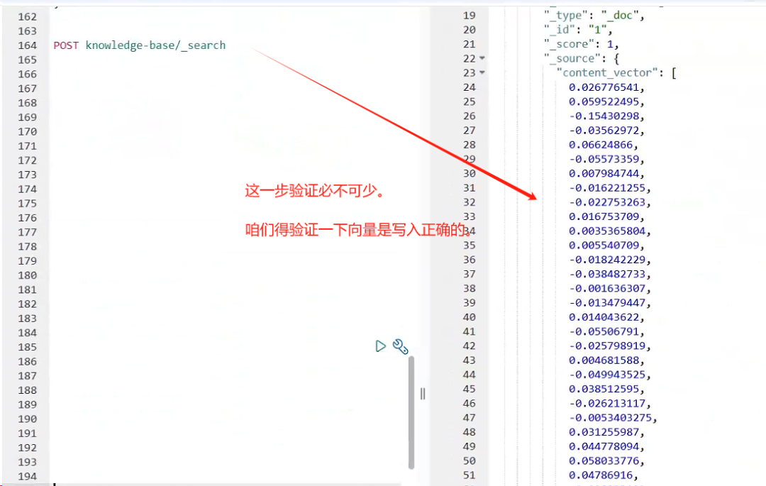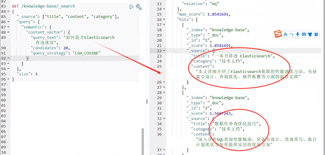 这个查询的效果令人惊喜。即使用户搜索"如何提升 Elasticsearch 查询速度",系统也能准确返回“一本书讲透 Elasticsearch"和"数据库查询优化技巧"等文档,因为它们在语义上高度相关。相关度高的排在前面。