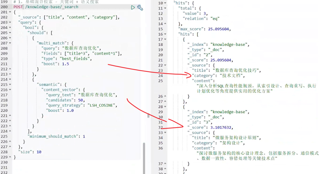 如下是一个混合检索查询,同时使用传统关键词匹配(multi_match)和AI语义理解(semantic)两种方式搜索"数据库查询优化",