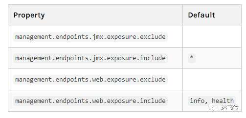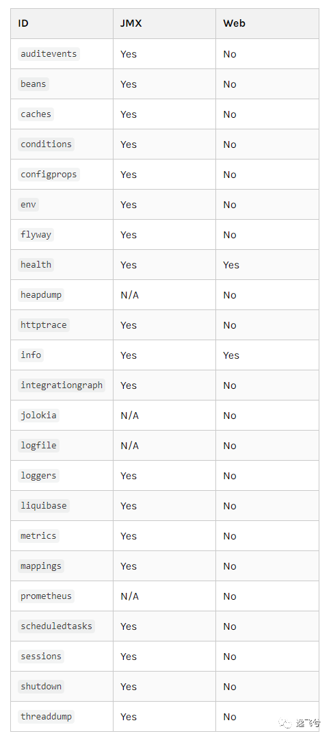 由于端点可能包含敏感信息,因此应仔细考虑何时暴露它们。下表显示了内置端点的默认开启情况:JMX端点基本都暴露,Web端点基本不暴露(除了 health