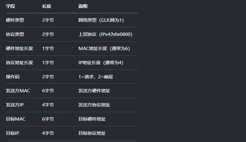 实现网络层地址(IP地址)与数据链路层地址(MAC地址)之间的动态转换; 建立并维护本地网络的IP-MAC映射表(ARP缓存表); 支持IPv4网络环境(IPv6使用NDP协议替代)。
