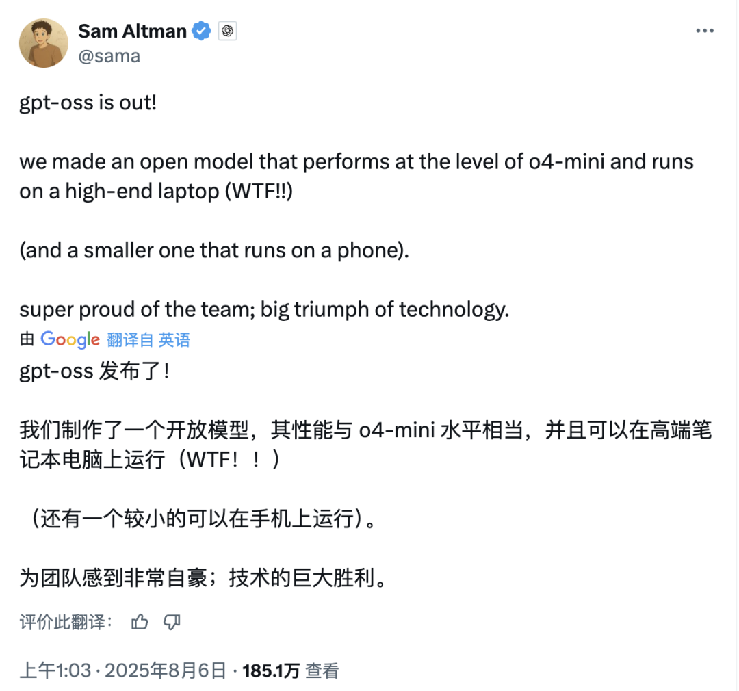 早晨起来一看,Sam Altman 发了个推说 GPT 又双叒叕开源了,这是 OpenAI 首次提供开放权重模型,而且上次开源已经是 GPT-2 时代了。