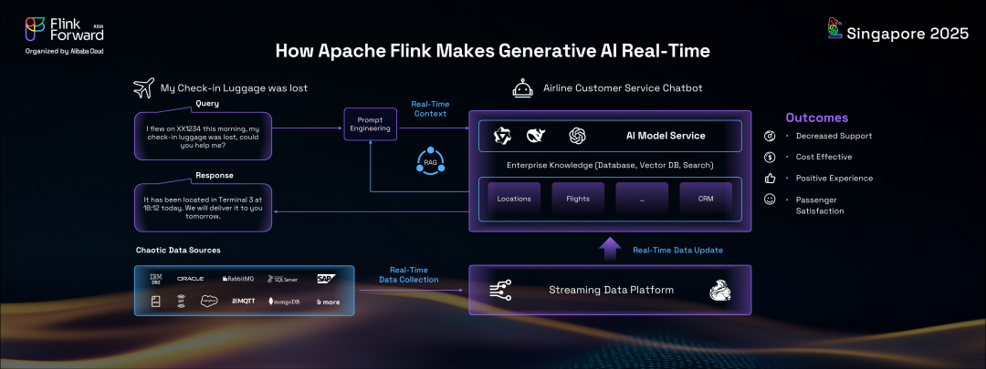 以航空公司客户服务聊天机器人为例。如果乘客的行李丢失,没有实时数据的传统聊天机器人可能无法提供准确信息。然而,通过在 AI 系统背后构建由Flink驱动的强大流数据平台,可以收集来自各种来源的实时数据并输入到 AI 中,确保聊天机器人始终保持更新并能够提供精确答案。这展示了 Flink 如何能够转换生成式AI系统,增强用户体验和准确性。