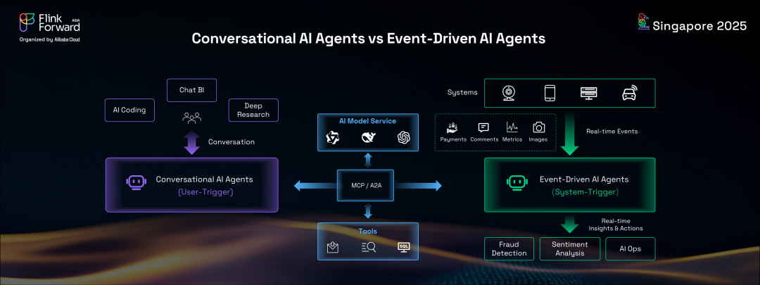 AI领域另一个快速兴起的趋势是 AI 智能体或智能体 AI(Agentic AI)的崛起。虽然存在许多类型的 AI 智能体,但它们基本上可以分为两种主要类型:对话式 AI 智能体和事件驱动 AI 智能体。对话式 AI 智能体,如 AI 编程工具、聊天BI和深度研究助手,通常由人类用户主动触发,用户与它们互动以提问和接收答案。相比之下,事件驱动 AI 智能体由系统触发,对来自汽车、手机、机器、PC 或服务器等各种来源发出的实时事件做出反应。这些智能体提供全面的智能洞察并采取及时行动,以反应模式而非主动模式运行。例子包括欺诈检测智能体、情感分析智能体和 AI 运维智能体。