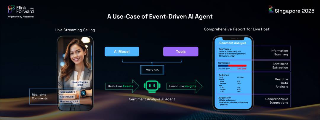 在这种流行的电商趋势中,观众发送源源不断的消息、评论和问题,在屏幕上快速刷新。主播几乎不可能跟上或阅读所有这些消息,更不用说从观众反馈中获得洞察了。然而,通过部署由 Flink 驱动的情感分析智能体,主播可以获得实时、全面的仪表板。这个仪表板不仅会显示传统的统计报告,如按地点和年龄划分的观众人口统计,还会提供实时情感分析,指示观众偏好、讨论话题,甚至提供动态建议。这种实时反馈循环使主播能够动态调整策略,吸引更多观众注意力并推动更多交易。