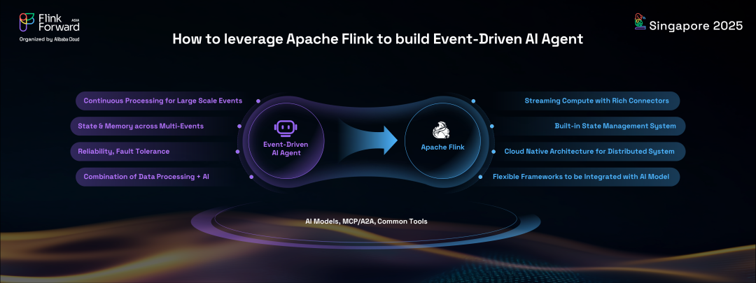除了核心 AI 模型、MCP 协议和通用工具外,这些智能体还需要强大的能力来持续处理大规模事件、高效的事件收集以及跨多个事件的强大状态管理或 AI 记忆。此外,这些在线分布式系统的可靠性和容错性至关重要。鉴于 Apache Flink 作为成功的事件驱动数据处理器的优势,它是构建事件驱动AI智能体实时运行时框架的理想选择。