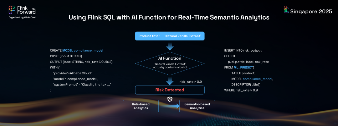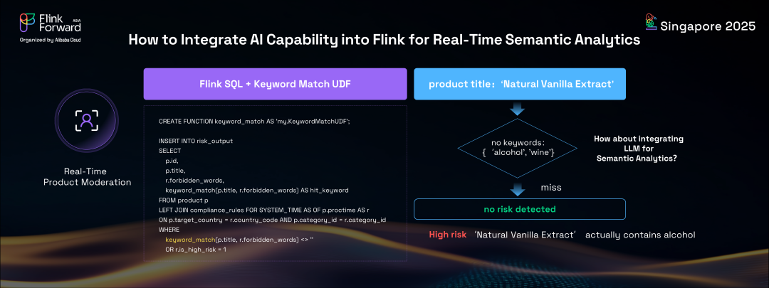 在讨论的最后部分,我们探索将强大的AI能力,特别是生成式 AI,集成到 Apache Flink 中的激动人心的集成。Flink 现在可以为客户执行实时语义分析,为智能数据处理开辟了新的可能性。让我们考虑一个具体的用例:电商平台上的产品审核。每个产品在上架前都必须经过严格的审核以确保合规。传统上,这涉及编写 Flink SQL 来连接产品发布流与合规规则表,并使用字符串匹配函数检查产品标题中的禁用关键词。这种基于规则的方法虽然有效,但有其局限性。