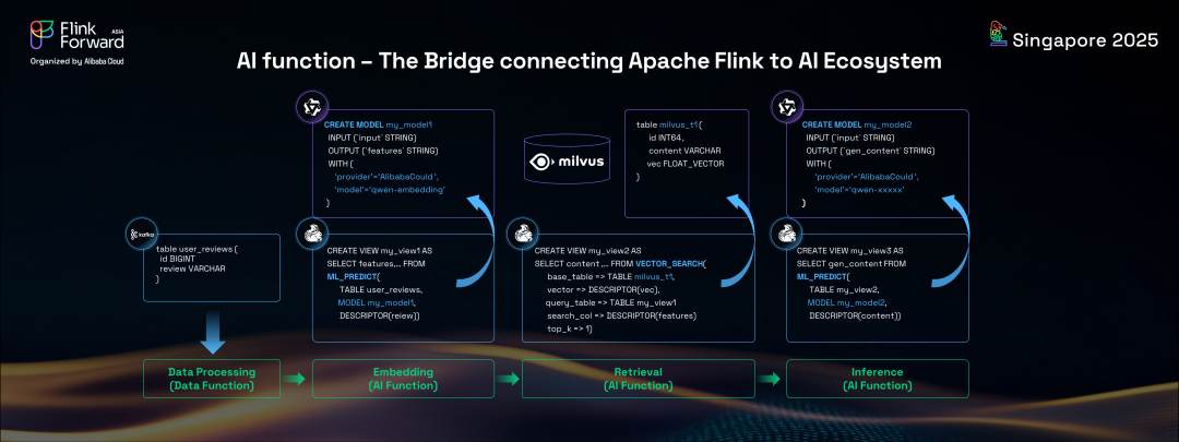 这个功能允许 Flink 用户直接在 Flink SQL 语句中调用AI语言模型服务并执行向量搜索,与传统的 SQL 数据处理并行。这意味着开发者可以使用 Flink SQL 创建或定义 AI 模型,指定模型名称、端点、API 密钥和系统提示等选项。将支持与 OpenAI 协议兼容的模型。