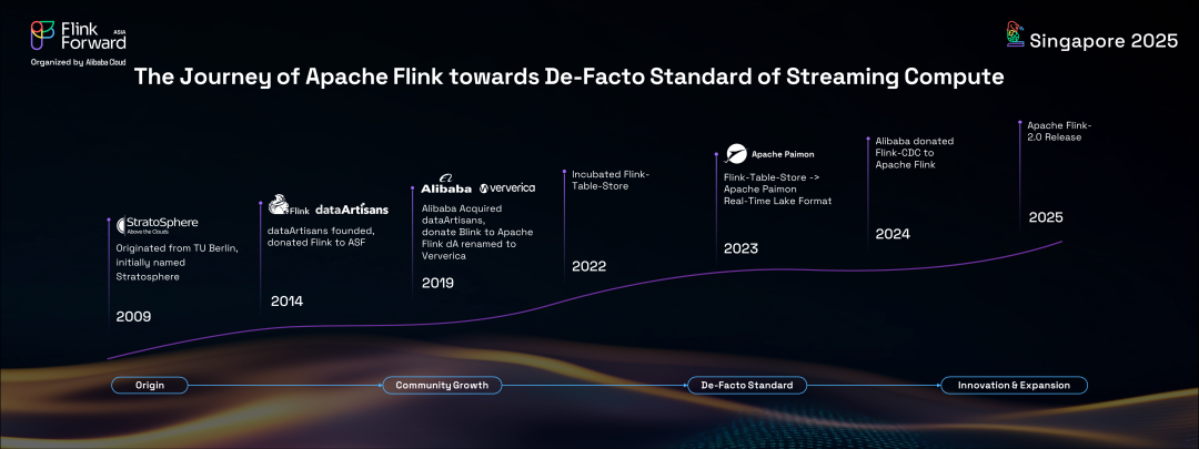 Apache Flink 的非凡旅程始于 2009 年,当时名为 Stratosphere,是德国柏林工业大学的一个研究项目。五年后,核心团队成立了dataArtisans 公司,并将该项目贡献给 Apache 软件基金会,重命名为 Flink。又过了五年,阿里巴巴收购了 dataArtisans,将其更名为 Ververica,并投入大量资源推动 Flink 成为实时数据分析中流处理的事实标准。创新仍在继续,最近的项目包括用于实时数据集成的 Flink CDC(变更数据捕获)和 Apache Paimon——一种源自 Flink 社区、现已成为独立 Apache 项目的实时数据湖格式。Flink 2.0 的正式发布为社区开启了新篇章,为下一个十年的进步奠定了基础。