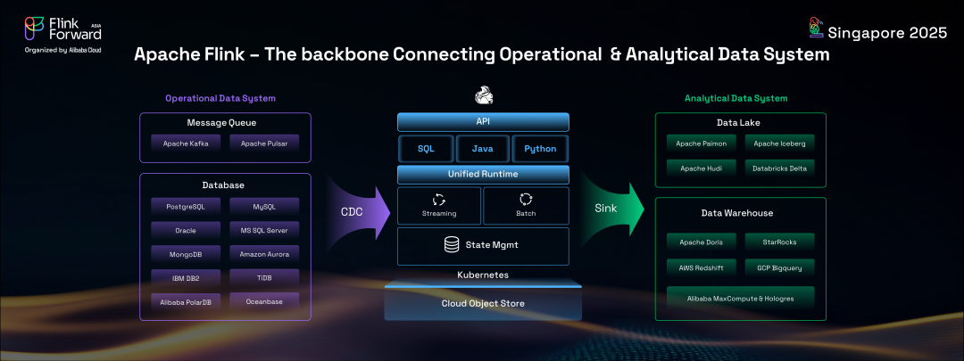 它充当着骨干,驱动实时数据流从操作系统流向分析系统。Flink 高效地从数据库和消息队列中捕获各种实时事件,执行复杂的流处理,然后无缝地将结果同步到数据湖和数据仓库。在过去十年中,Apache Flink 的架构已演进为完全云原生,简化了开发者在云环境中的部署。因此,包括阿里云在内的大多数云供应商现在都提供 Apache Flink 的托管服务,使全球企业更容易使用该技术。