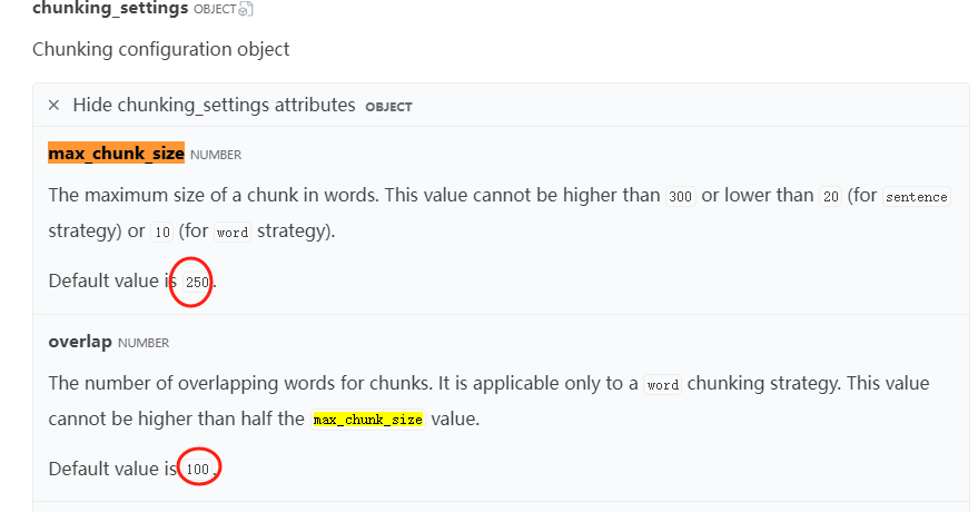 max_chunk_size:块中的最大词数(必需) overlap:块间重叠词数(必需,不能超过max_chunk_size的一半)