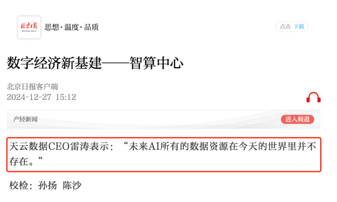 高质量人类数据即将耗尽:可用于训练模型的优质数据增长已跟不上AI发展的需求;去年底,在接受北京日报媒体采访时,天云数据CEO雷涛就曾表示:“未来AI所有的数据资源在今天的世界里并不存在。”
