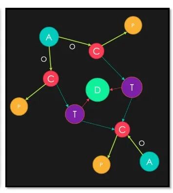 如果上面的关系表中的实体与关联关系用图数据库来表达,并可视化的呈现出来后,是这样的效果: