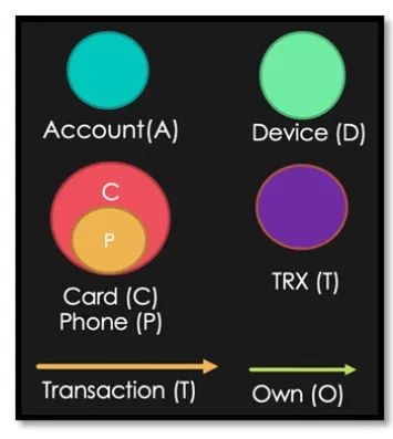 ·实体:直接发生交易的卡(卡的属性包含账号、电话)、商户(商户属性信息)