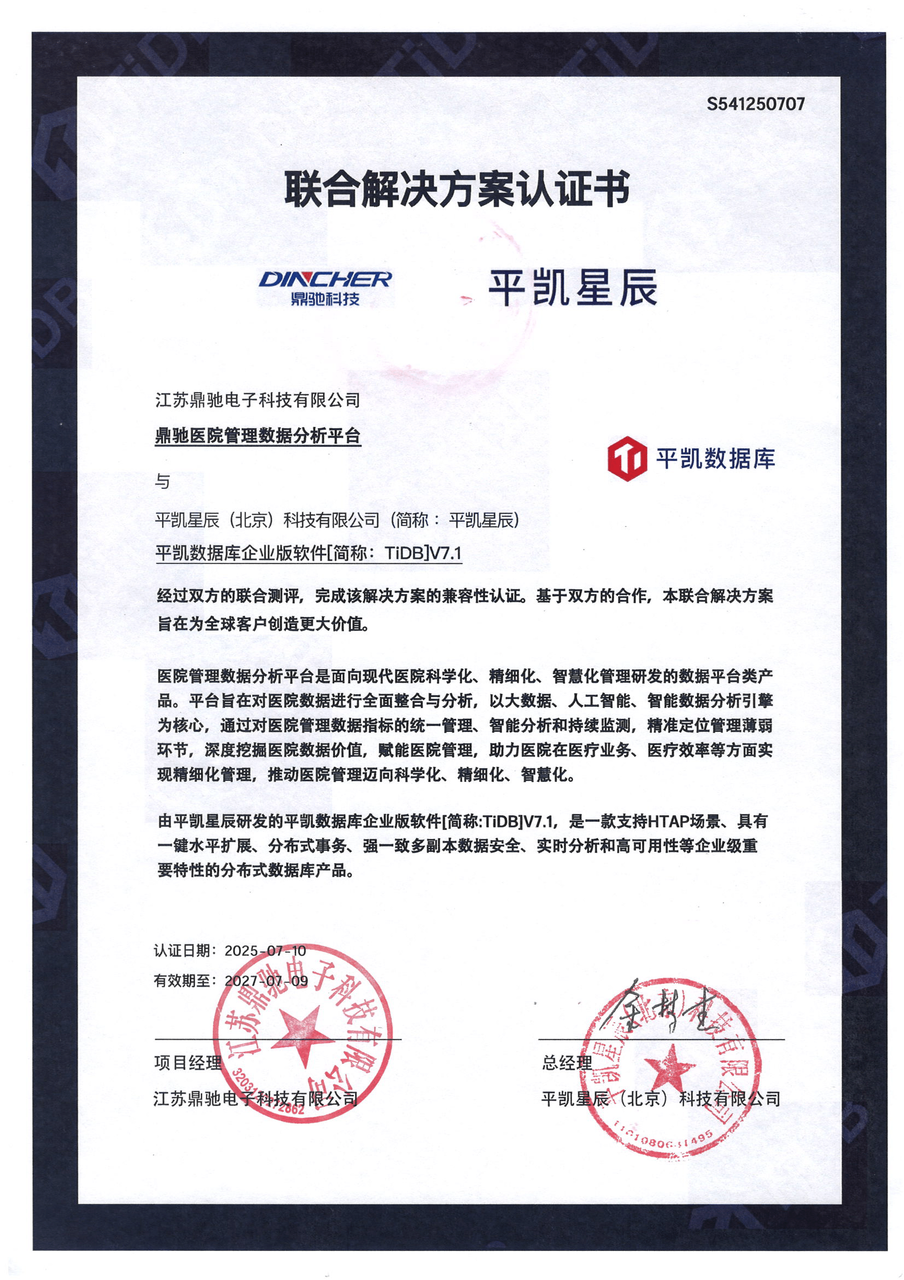 近日,平凯数据库与鼎驰医院管理数据分析平台完成联合解决方案认证。此次合作以“数据底座+智能分析”的深度融合,旨在为广大的医院提供从数据整合到智慧决策的全流程解决方案,助力医院破解管理痛点,加速向科学化、精细化、智慧化管理转型。