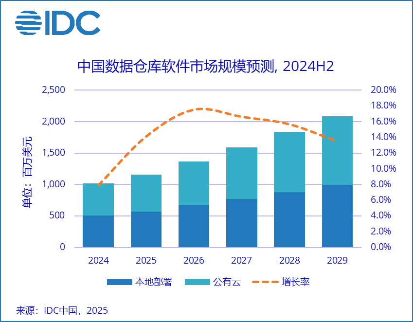 IDC预测, 到2029年,中国数据仓库软件市场规模将达到20.9亿美元,2024-2029的5年市场年复合增长率(CAGR)为15.5%。