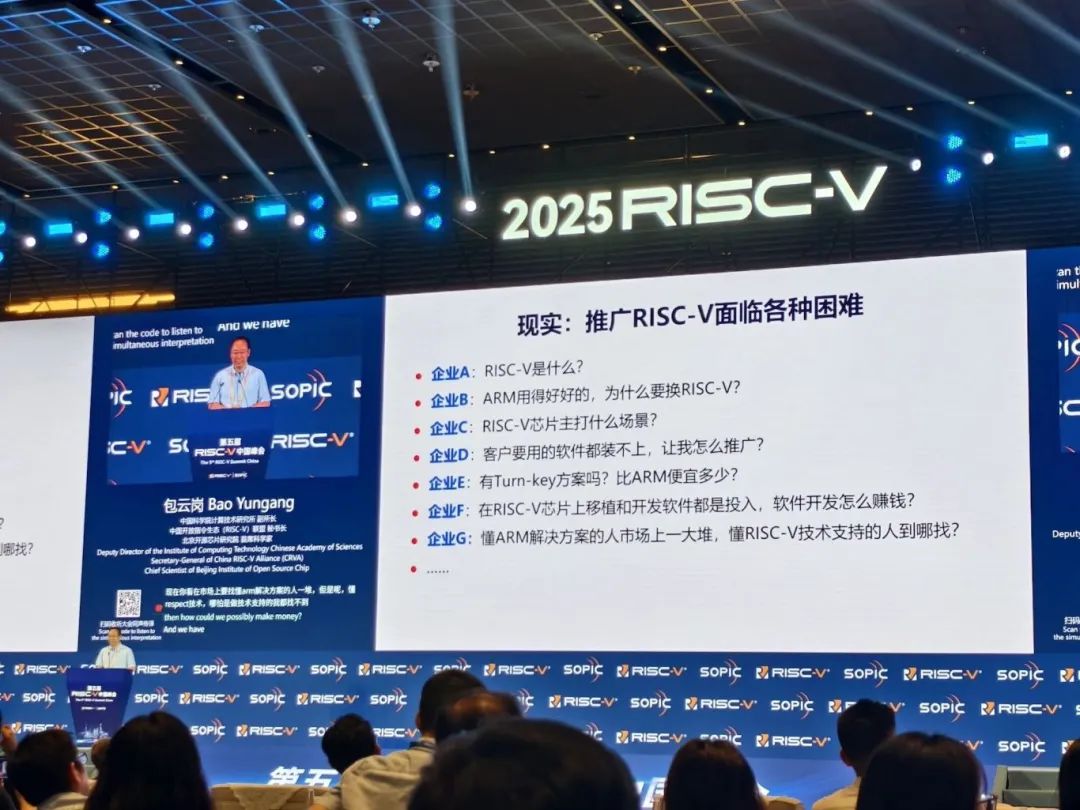 开芯院首席科学家包云岗也带来了干货满满的名为《关于RISC-V生态建设的几点观察与思考》主旨演讲,他指出,当前 RISC-V 产业落地需迫切解决以下几个问题: