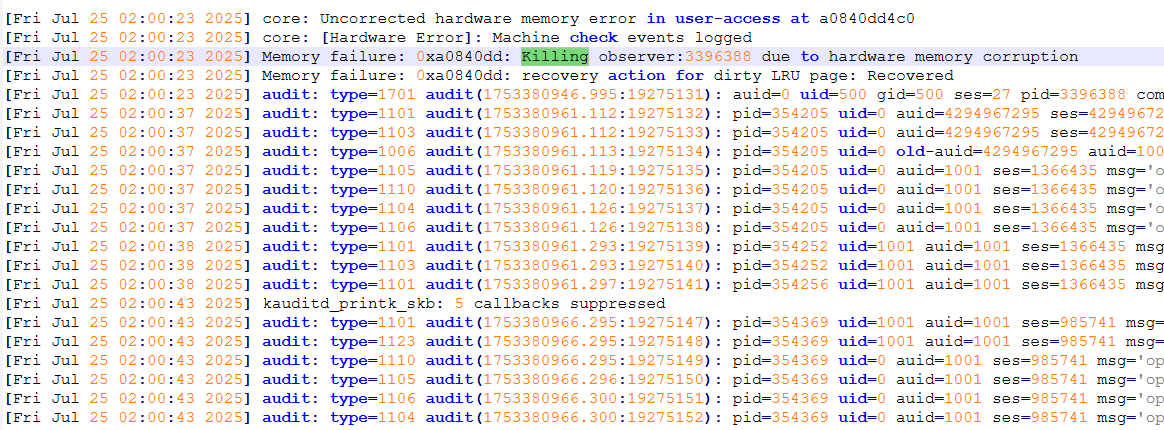 [Fri Jul 25 02:00:23 2025] Memory failure: 0xa0840dd: Killing observer:3396388 due to hardware memory corruption