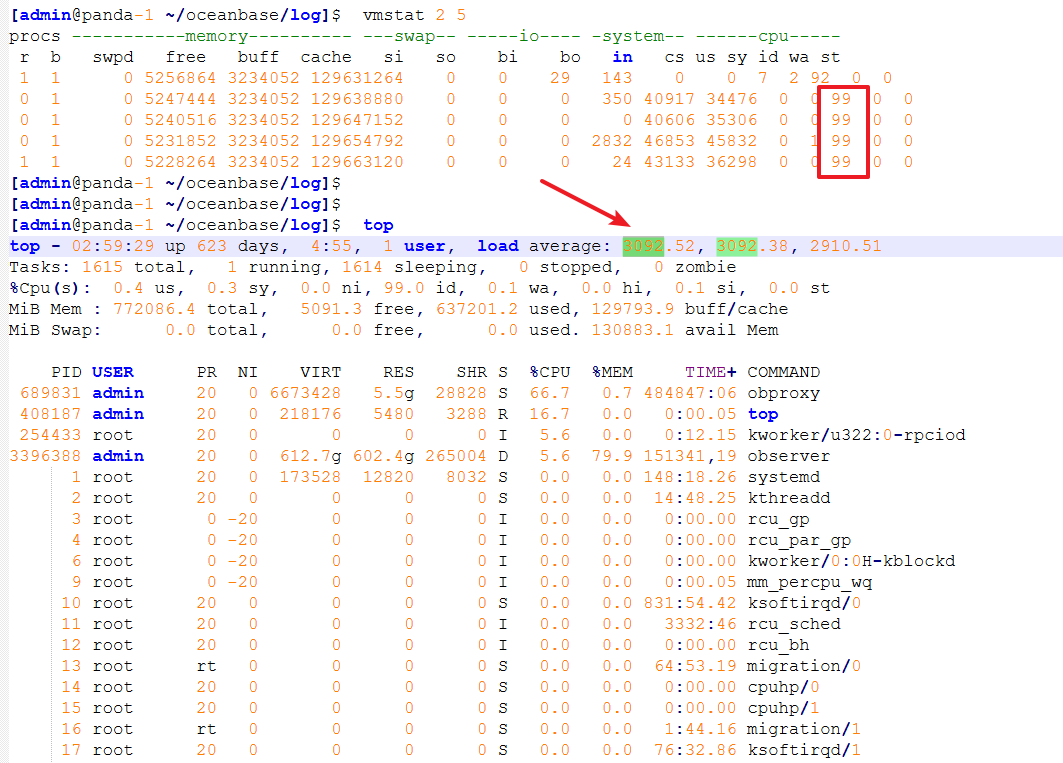 admin 3396388 1 99 2023 ? 6305-21:20:04 /home/admin/oceanbase/bin/observer