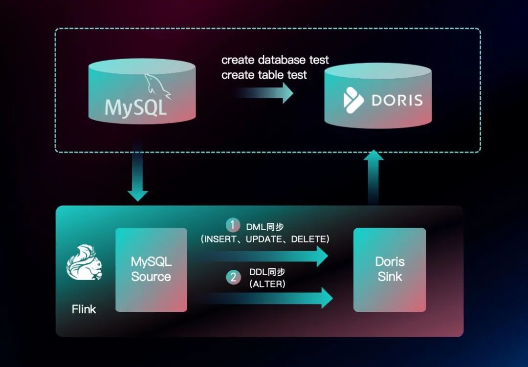 Flink-Doris-Connector的出现,让这种合作变得更加紧密。最让人印象深刻的是整库同步功能——以前从MySQL同步数据到分析系统,需要写一堆脚本,配置一堆规则,现在用Flink CDC + Doris,一行命令就能搞定整个数据库的同步(Mysql为例