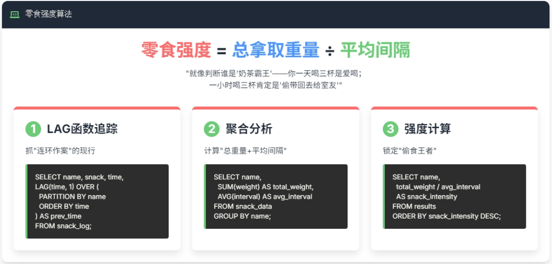 total_weight avg_interval AS snack_intensity -- 核心指标
