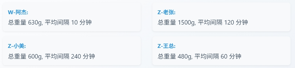 第二步:聚合算“总重量+平均间隔”——谁是“大胃王”?