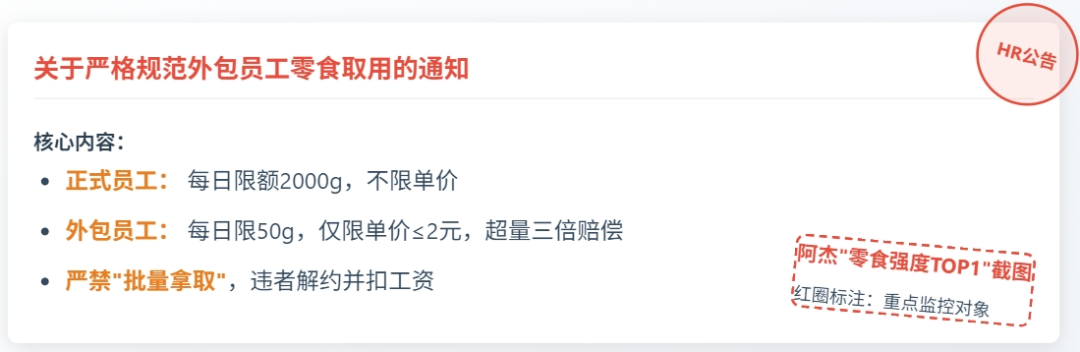 外包员工(W开头工号):每日限取50g(仅可拿单价≤2元的零食),超出部分按市场价3倍赔偿;