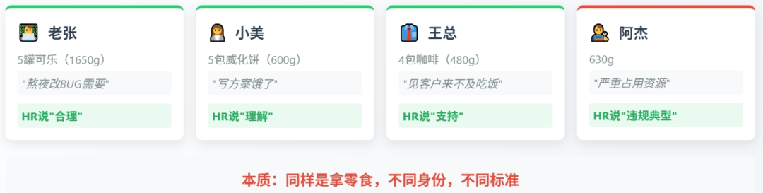 老张昨天拿了5罐可乐(1650g),说是“熬夜改BUG需要”,HR说“合理”;小美拿了5包威化饼(600g),说是“写方案饿了”,HR说“理解”;王总拿了4包挂耳咖啡(480g),说是“见客户来不及吃饭”,HR说“支持”;而阿杰拿了630g,就是“严重占用资源”?