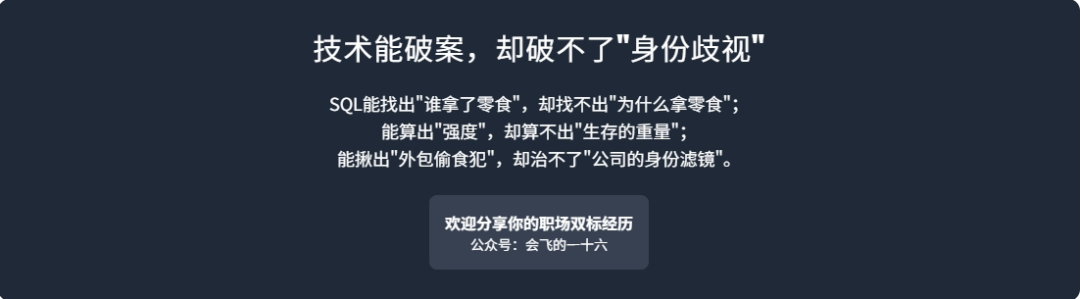 公众号:会飞的一十六用SQL写尽职场荒唐,用段子戳破“高端职场”的遮羞布~ 关注我,下次带你用SQL算“老板的咖啡偷喝率”!😜