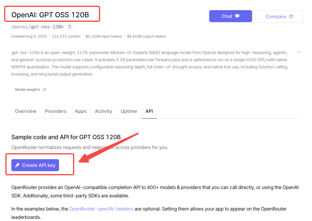 OpenRouter是一家提供统一API接口聚合多个主流AI模型(如OpenAI、Claude等)的服务平台,让开发者通过单一接入点调用不同大语言模型。在OpenRouter上免费创建OpenAI gpt-oss-120b的API KEY就可以尝鲜使用啦。