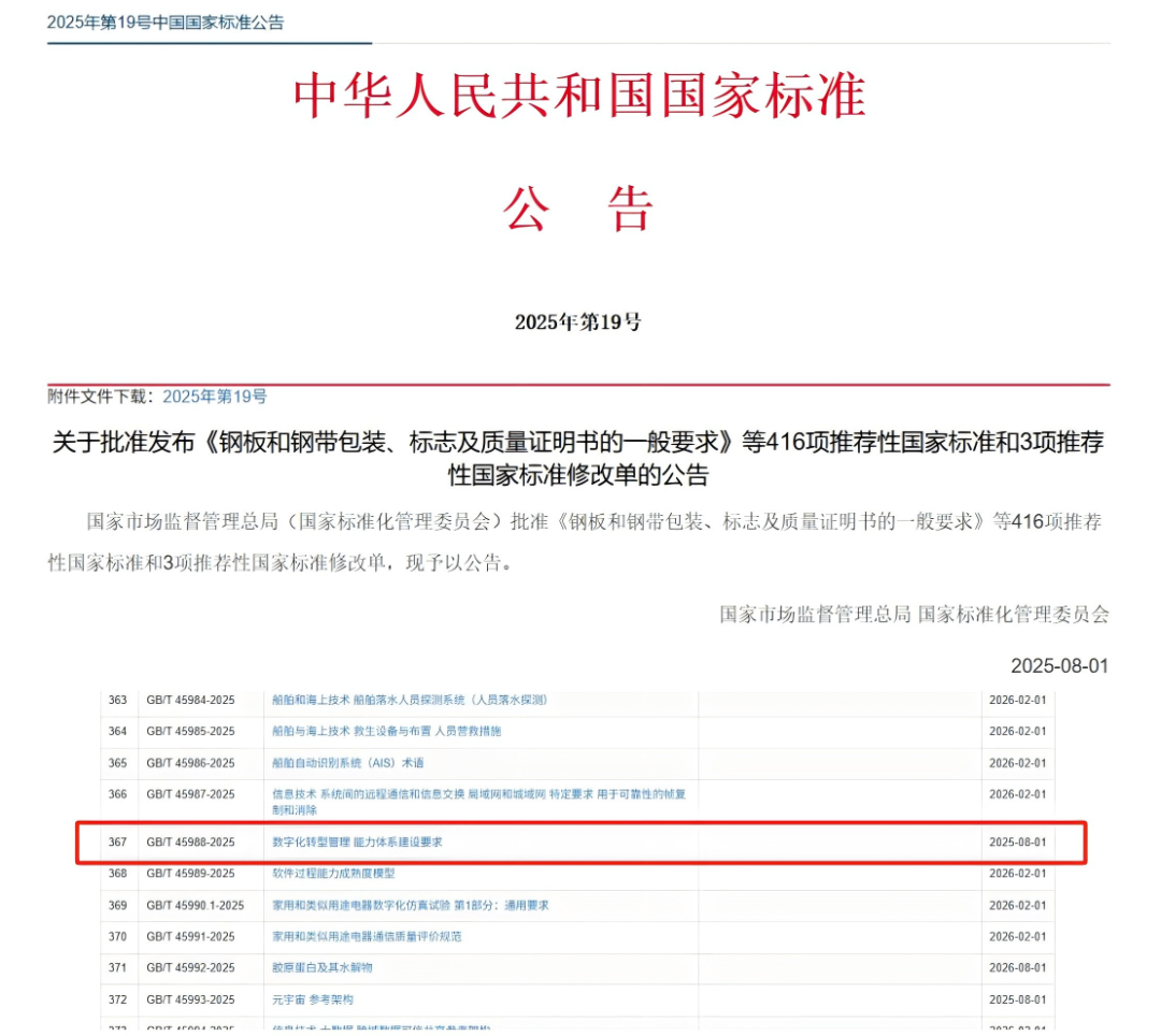 2025年8月1日,国家市场监督管理总局(国家标准化管理委员会)发布2025年第19号中国国家标准公告,批准GB/T 45988-2025《数字化转型管理 能力体系建设要求》国家标准正式发布。
