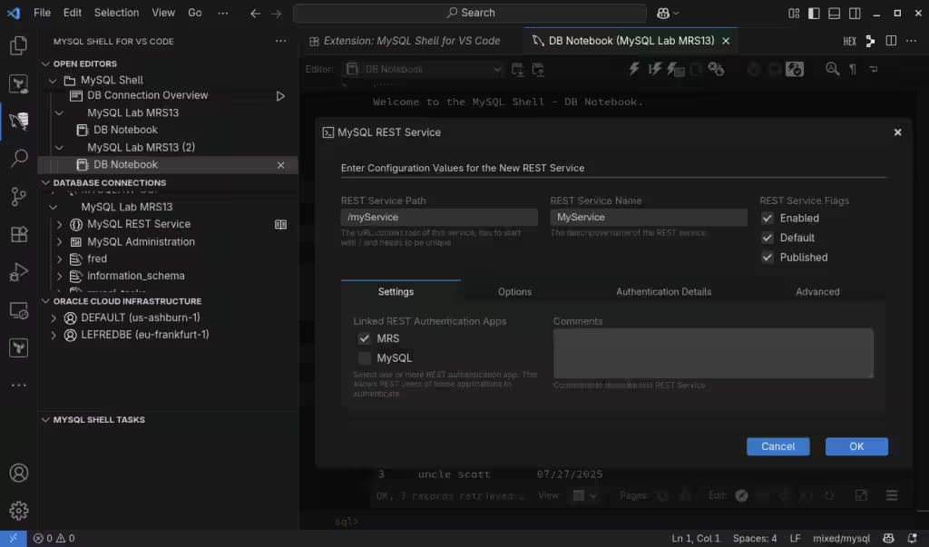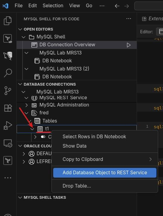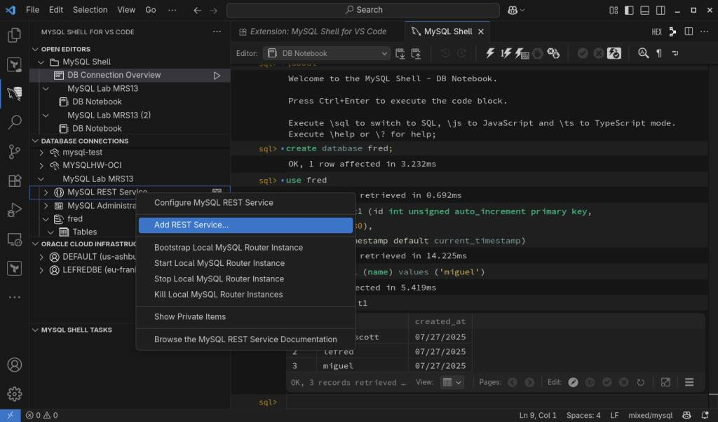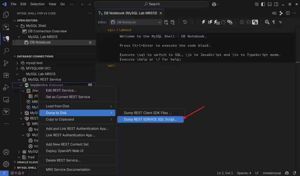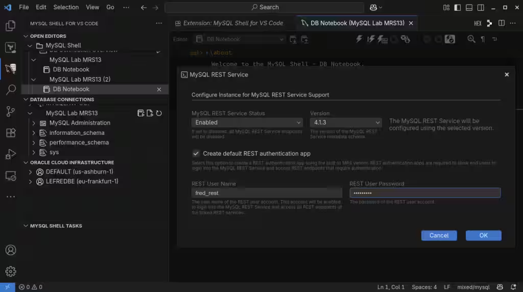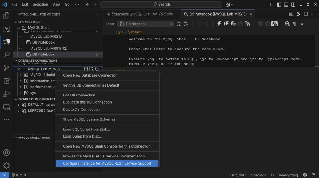 即使可以使用命令行客户端创建它,也只能使用最新的 MySQL Shell (mysqlsh),不要尝试使用旧的经典 MySQL 客户端,我建议使用 Visual Studio Code 的 MySQL Shell 来设置和配置 MySQL REST 服务。