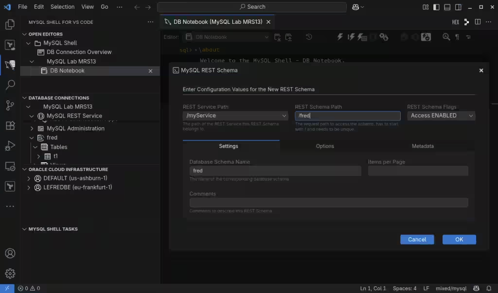 创建连接后,在左侧列表中右键单击该连接,并为 MySQL REST 服务配置实例。此操作还将生成我们之前讨论过的元数据 Schema:
